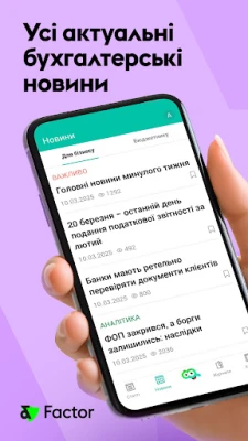 Factor - унікальний мобільний додаток для бухгалтера, де ви знайдете для себе свіжі новини саме для вашого сегменту бухобліку, статті та професійні журнали, книги з будь-якої бухгалтерської тематики. Додаток стане незамінним як для комерційних бухгалтерів, так і для бухгалтерів бюджетних установ.