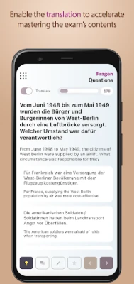 Effortlessly prepare for the Germany's Einbürgerungstest, also known as the "Leben in Deutschland" Prüfung exam, with the LebenPro app! This powerful tool offers an efficient way to get ready for the exam using our unique inline translation feature, providing instant translations of questions Fragen and answers Antworten in seven languages: English, Turkish, Arabic, Ukrainian, Russian, Polish, and Persian.
