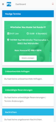 Funktionen: - Gesichertes Log-In System für Service-Mitarbeiter - Arbeitswünsche, Urlaub und Wochenplan per App melden - Terminverwaltung im internen Kalender aktualisiert einsehen - Arbeits-Zeiten direkt per App melden - Abrechnungsfunktion direkt in der App - Service-Mitarbeiter können sich selbst beim Einsatz einchecken - Direkt aus der App Nachrichten schicken und empfangen
