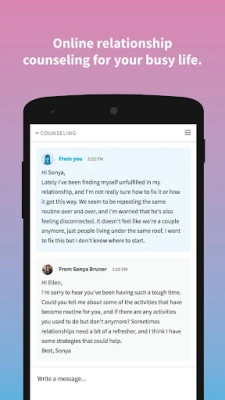 After filling out our questionnaire, you will be matched with a licensed therapist based on your needs and preferences. You and your therapist will get your own secure and private “therapy room” where you can message your therapist at any time, from any internet-connected device, wherever you are. Your partner will be invited to this room as well if you decide to try therapy together. You can also schedule a session so speak live with your therapist over video or phone.