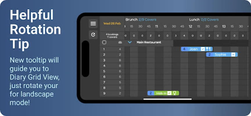 Auto-sync capabilities - syncs to your main diary for instant information Table management - control your whole service from your ipad Intuitive booking management - Drag and drop, pinch and zoom functionality for ease of use User permissions - assigns different users their own permissions, determined by their authority Group access - access all restaurants in one group from a single log in