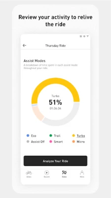 • Rides recorded on a Turbo e-bike will display Turbo-specific metrics, including levels of assistance used during the ride, battery usage over time, and average motor power use.